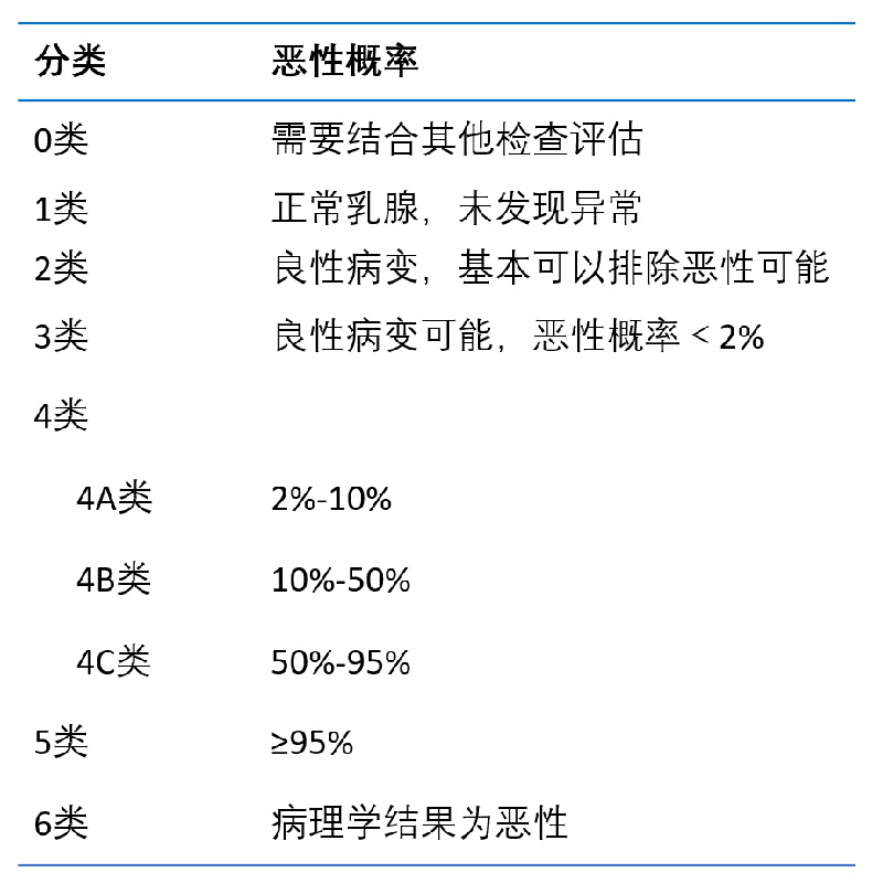 BI-RADS系統可分為0-6類。其中0類指醫生懷疑有惡性可能,但是沒有從超聲檢查中獲取充分的證據,需要結合其他檢查結果評估。其余1-6類,類別越高,惡性概率越高。各類別惡性概率如下表所示。因此,如果看到自己的報告單上寫著“BI-RADS 1類”或“BI-RADS 2類”,可以稍稍放下心來,定期復查;如果報告單上寫著0類或3、4、5、6類,則需要及時前往醫院就診,請醫生給出專業意見。