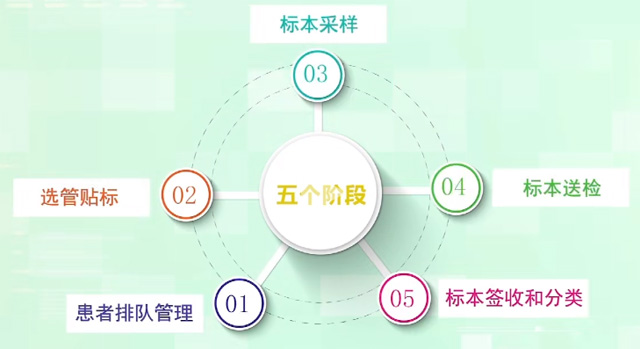 患者排隊管理 選管貼標 樣本采樣 樣本送檢  標本簽收跟分類。這5個階段是醫院臨床檢驗分析前需要經過的標準流程。完成這些流程原來是靠人工操作來完成。這種人工操作,占用了醫護人員的大量時間,導致了抽血檢查的效率不高。容易出錯以及一系列不規范問題。1%的失誤將會對患者的健康生命帶來嚴重的威脅。需要更好的來完成這些流程跟解決這些問題。讓醫護人員的醫護效率提高服務更好醫療更精確。