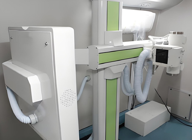 首先按下綠色的電源開關按鍵,整個車載DR設備就會通電。再按下高壓發生器的開機鍵,然后電腦主機也開機運行。打開DR工作站系統,它開機的話有一個過程,需要幾分鐘時間,DR室門口有門開關跟當心電離輻射提醒標志。檢查室里面有按鈕可以把設備調高調低,檢查時候這個手背著臀部上一點點,反向胸部靠著DR,通過升降來調整擺位的一個狀態。還可以通過搖把來調整探測器跟球管的高度。還有線束器的一個調節。我們一般拍胸片的話,一般不用管這個操作。 一般出廠設置跳到了一個合適的范圍了。控制平臺也是可以控制開關門,并不需要按門口的按鍵。