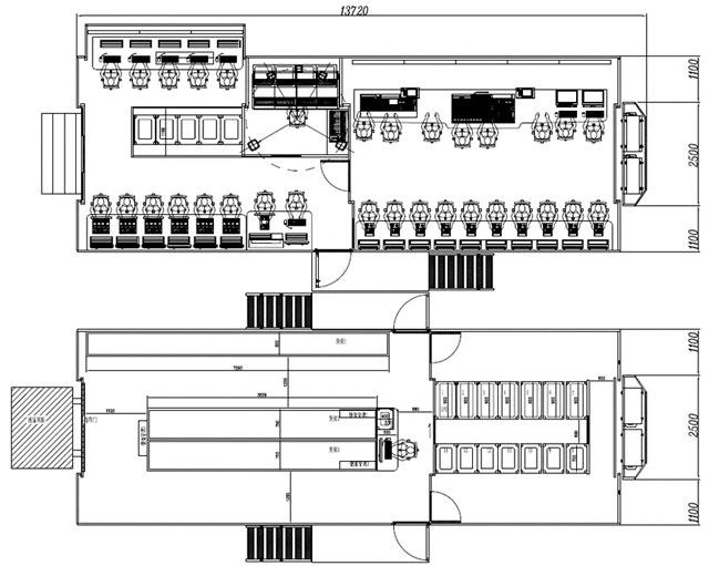 由于收車時內套拉箱頂收回,強冷機柜若在拉箱區,出回風會很難設計,所以通常將強冷柜放在不帶拉箱的部位,加上兩側拉箱總寬度不得超2.5米,這導致整個廂體很難做大,以下是幾種最常見的布局,基本都是配備4組強冷機柜,如果想要增加強冷機柜數量,就需要減小拉箱面積,這就會影響到制作區和技術區面積。無論是單外套還是雙外套,由于拉箱頂在主頂外邊,強冷的出回風就比較好設計,但同樣受到兩側拉箱總寬度不得超2.5米的限制,廂體也不可能做太大,可以考慮配合第三級內套拉箱使用由于內外套是采用上下疊加的形式,避開了左右相加不能超2.55米的限制,所以設計起來就比較靈活,也能做得更大,強冷區只要避開內套拉箱,出回風也比較好設計。以下是最近國內比較常見的布局。