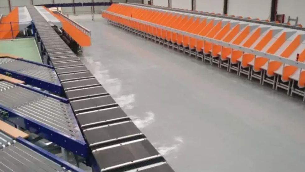 交叉帶分揀機,交叉帶分揀機有很多種型式,比較普遍的為一車雙帶式,即一個小車上面有兩段垂直的皮帶,既可以每段皮帶上搬送一個包裹也可以兩段皮帶合起來搬送一個包裹。在兩段皮帶合起來搬送一個包裹的情況下,可以通過在分揀機兩段皮帶方向的預動作,使包裹的方向與分揀方向相一直以減少格口的間距要求。優點:噪音低、可分揀貨物的范圍廣,通過雙邊供包及格口優化可以實現單臺最大能力約2萬件每小時。缺點:造價比較昂貴、維護費用高。