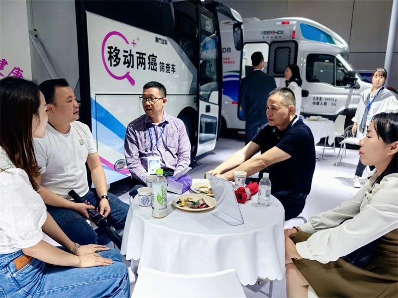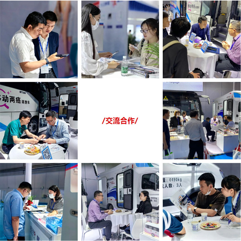 2臺移動兩癌篩查車、車載全體位DR在現場吸引了大量眼球,紛紛駐足停留,上車參觀洽談。