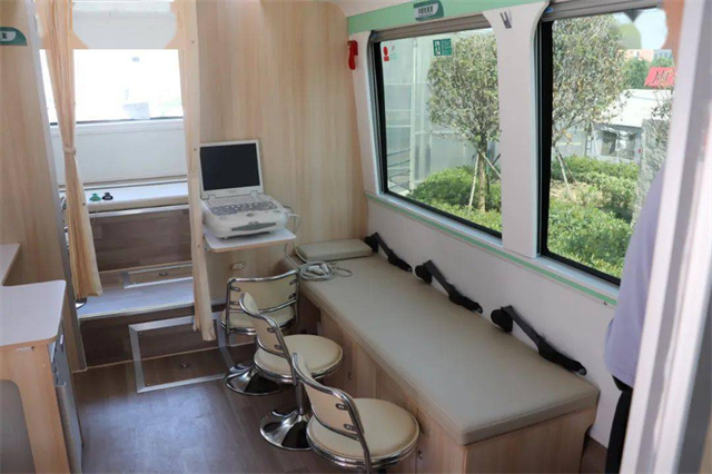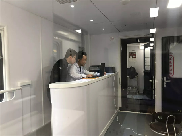 體檢車上都有這些檢查室?車廂里有男女彩超室,男女心電圖室,內科、外科以及,骨密度、碳十三檢測室等,可以對血常規、肝膽功能,腎功能、空腹血糖、尿常規,心電圖、肝膽胰脾B超等項目進行檢查。車上都有這些功能室?候診登記處可以在候診區等待就診,各類醫療用品和采樣冷藏柜也很完善。體檢車廂配置了全自動生化分析儀、全自動尿液分析儀、B超檢查室、心電圖檢查室等,可以進行前臺導診、采血、尿液檢查、實驗室化驗、DR拍攝、超聲心電檢查等項目,能夠為職工進行全面體檢,最快當天即可出結果。