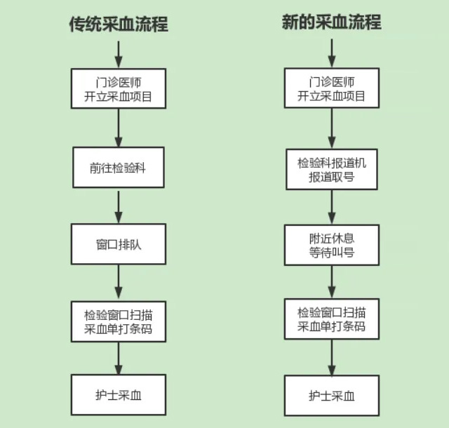門診醫師開采血項目>報道機報道取號>座位休息等待叫號機叫號>檢驗窗口掃描采血單條碼>護士采血