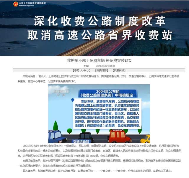 報道稱: 央視網消息 :前幾天,上海高速上救護車行駛至出口時被收費站攔下,要求繳納通行費,對此,交通運輸部表示,已要求各地交通部門主動聯系醫院、急救中心等單位,為救護車輛免費安裝ETC。 2004年公布的《收費公路管理條例》中明確規定,軍隊車輛、武警部隊車輛,公安機關在轄區內收費公路上處理交通事故、執行正常巡邏任務和處置突發事件的統一標志的制式警車,以及經國務院交通主管部門或者省、自治區、直轄市人民政府批準執行搶險救災任務的車輛,免交車輛通行費。進行跨區作業的聯合收割機、運輸聯合收割機(包括插秧機)的車輛,免交車輛通行費。 交通運輸部表示,救護車輛不屬于《收費公路管理條例》規定的免交車輛通行費車輛范圍。根據相關政策規定,取消省界收費站后全國高速公路一體化運行的新要求,各地對自行出臺的相關政策進行了清理規范。 顧志峰表示,取消省界站以后,救護車跨省行駛,如果政策不統一,一個省交費,一個省免費,會帶來非常多的問題,車輛也快不起來。