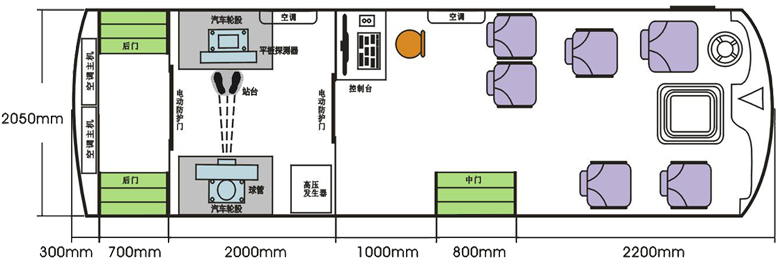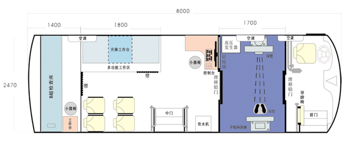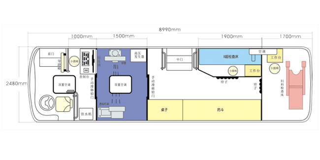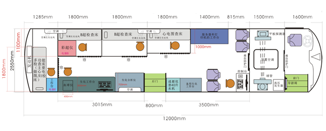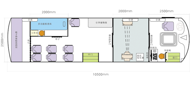 車載DR體檢車功能卻很齊全,車上配裝X光機、心電超聲檢查、電測聽室、全自動生化分析儀以及檢查床、冰柜、空調和紫外線消毒燈等先進醫療儀器設備。